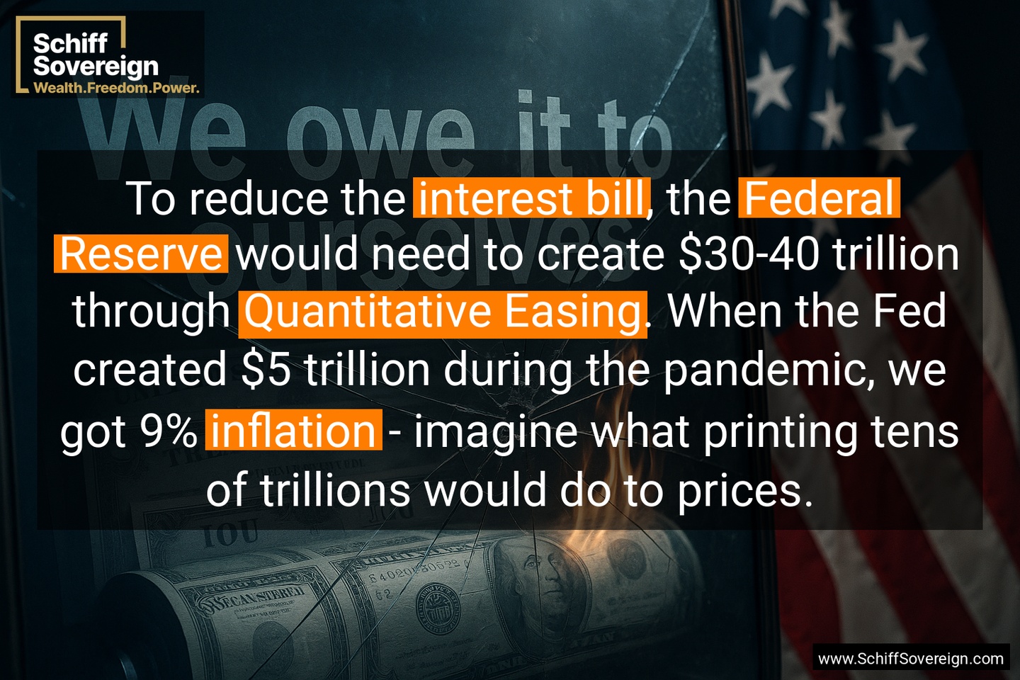 To reduce the *interest bill*, the *Federal Reserve* would need to create $30-40 trillion through *Quantitative Easing*. When the Fed created $5 trillion during the pandemic, we got 9% *inflation* - imagine what printing tens of trillions would do to prices.