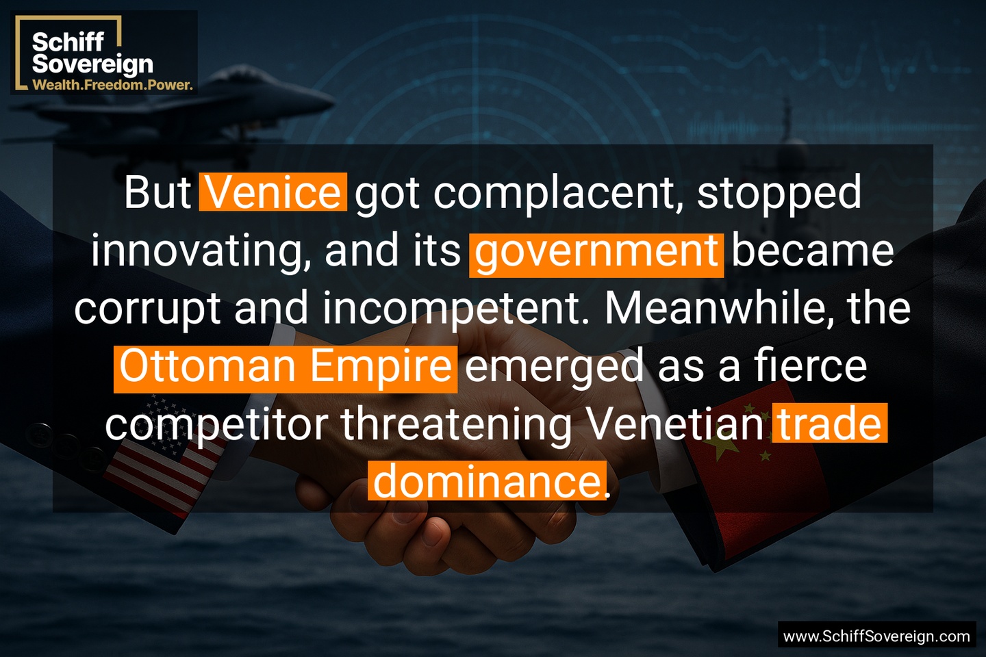 But *Venice* got complacent, stopped innovating, and its *government* became corrupt and incompetent. Meanwhile, the *Ottoman Empire* emerged as a fierce competitor threatening Venetian *trade dominance*.