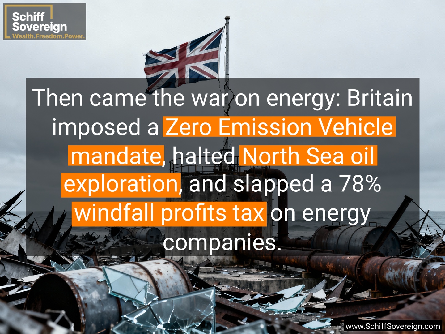 Then came the war on energy: Britain imposed a *Zero Emission Vehicle mandate*, halted *North Sea oil exploration*, and slapped a 78% *windfall profits tax* on energy companies.