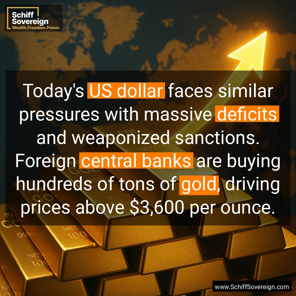 Today's *US dollar* faces similar pressures with massive *deficits* and weaponized sanctions. Foreign *central banks* are buying hundreds of tons of *gold*, driving prices above $3,600 per ounce.