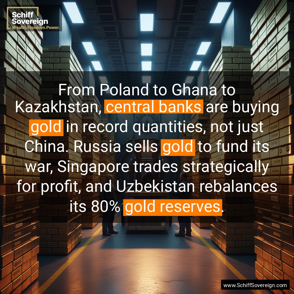 From Poland to Ghana to Kazakhstan, *central banks* are buying *gold* in record quantities, not just China. Russia sells *gold* to fund its war, Singapore trades strategically for profit, and Uzbekistan rebalances its 80% *gold reserves*.