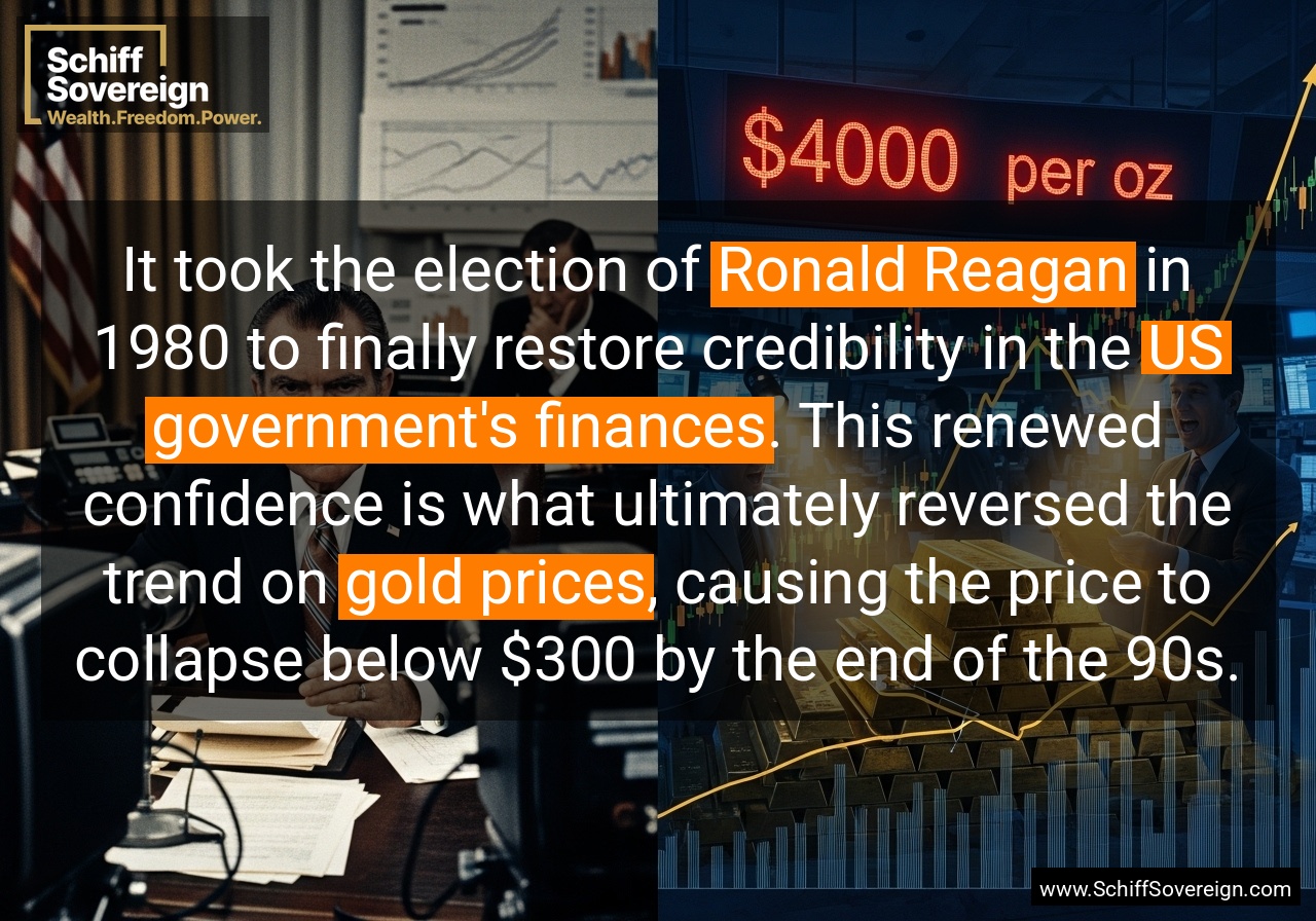 It took the election of *Ronald Reagan* in 1980 to finally restore credibility in the *US government's finances*. This renewed confidence is what ultimately reversed the trend on *gold prices*, causing the price to collapse below $300 by the end of the 90s.