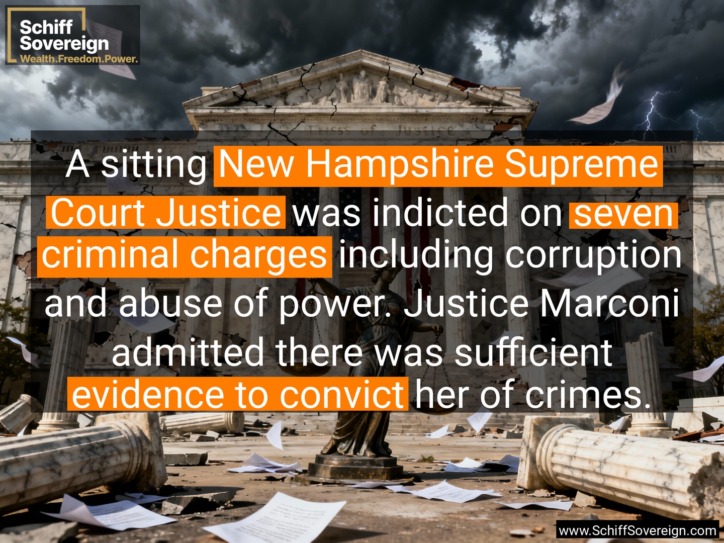 A sitting *New Hampshire Supreme Court Justice* was indicted on *seven criminal charges* including corruption and abuse of power. Justice Marconi admitted there was sufficient *evidence to convict* her of crimes.