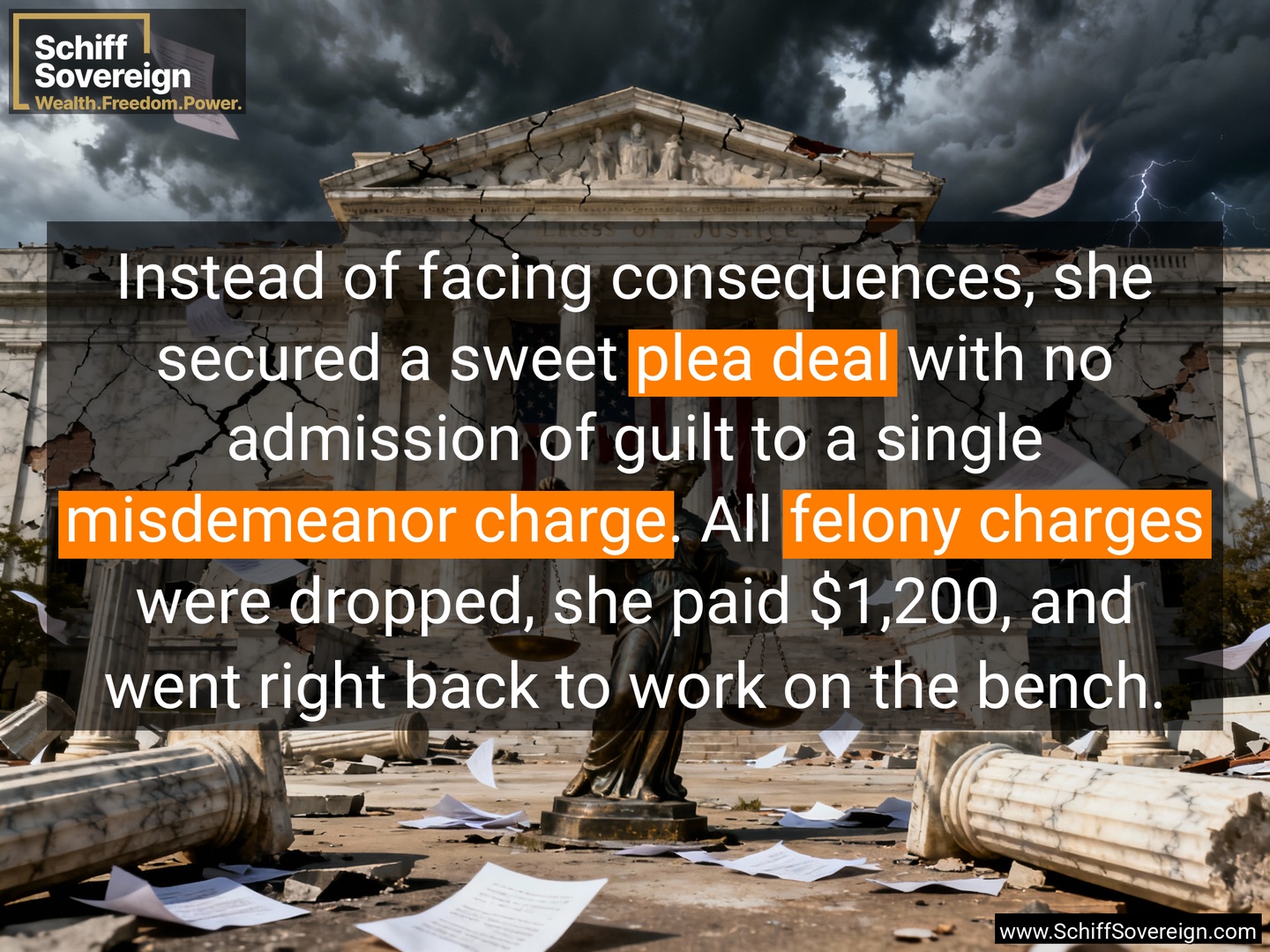 Instead of facing consequences, she secured a sweet *plea deal* with no admission of guilt to a single *misdemeanor charge*. All *felony charges* were dropped, she paid $1,200, and went right back to work on the bench.
