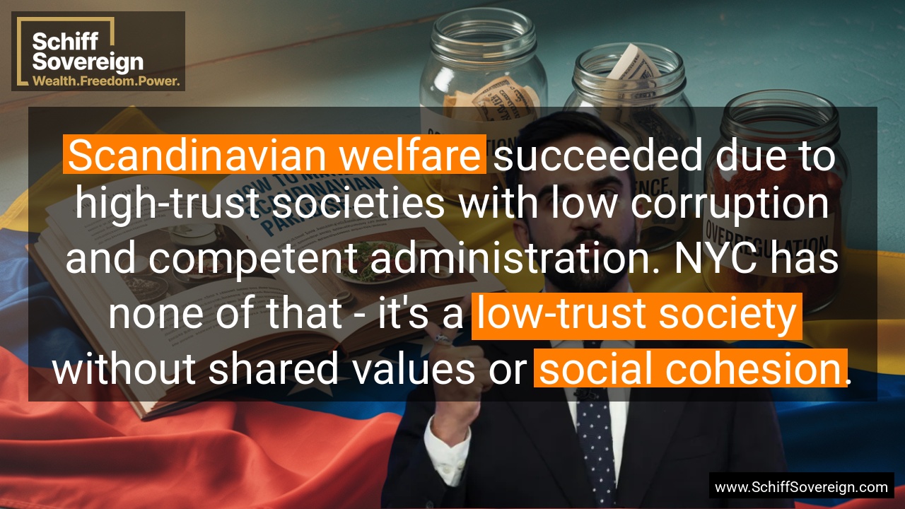 *Scandinavian welfare* succeeded due to high-trust societies with low corruption and competent administration. NYC has none of that - it's a *low-trust society* without shared values or *social cohesion*.