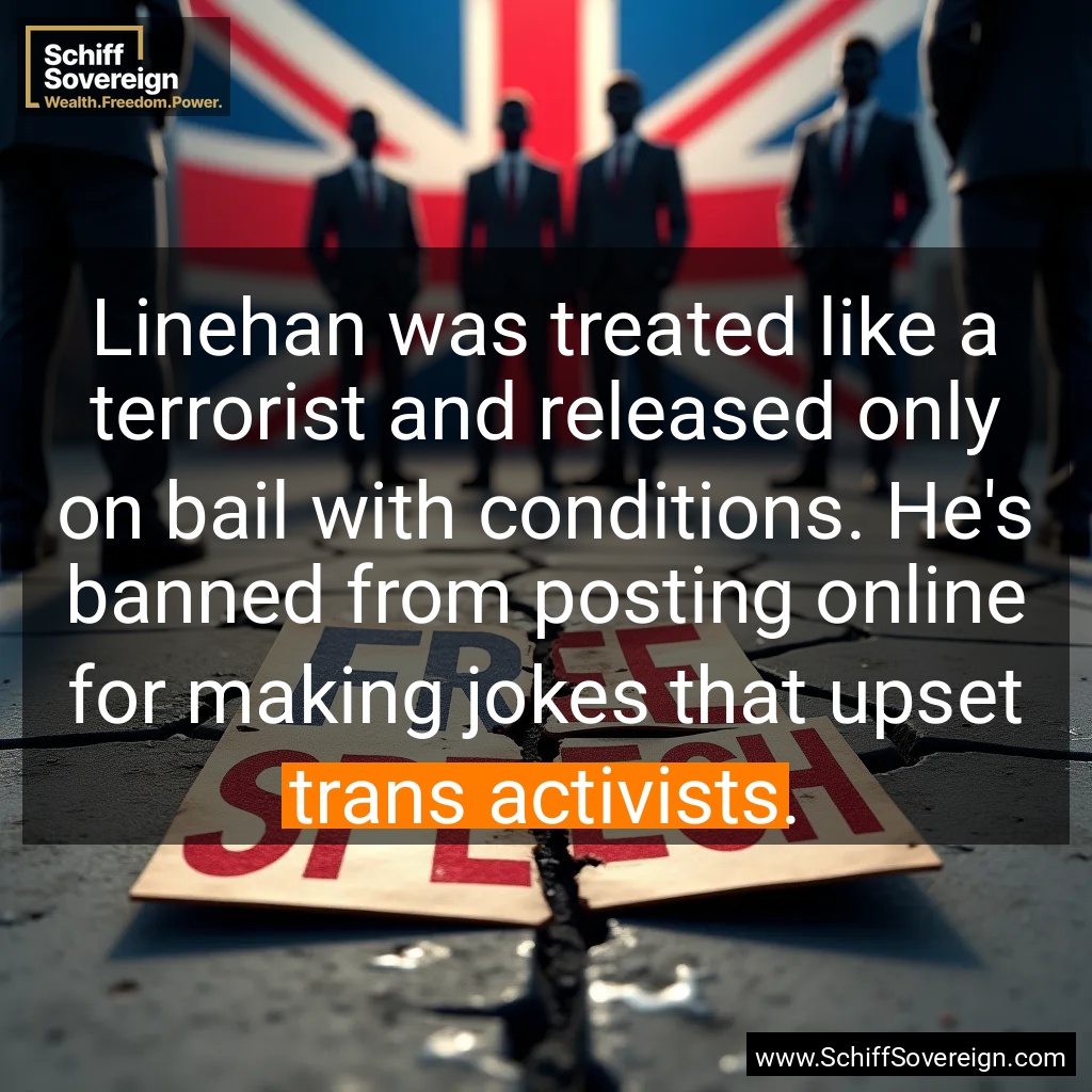 Linehan was treated like a terrorist and released only on bail with conditions. He's banned from posting online for making jokes that upset *trans activists*.