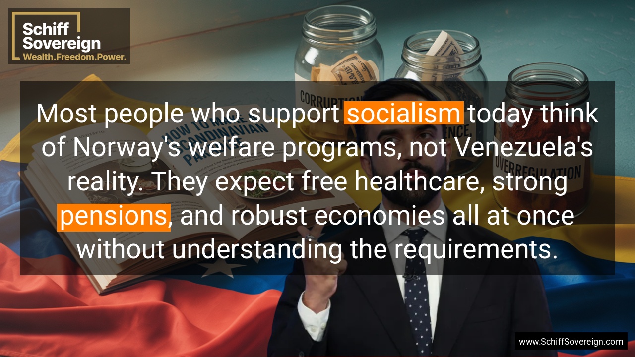 Most people who support *socialism* today think of Norway's welfare programs, not Venezuela's reality. They expect free healthcare, strong *pensions*, and robust economies all at once without understanding the requirements.