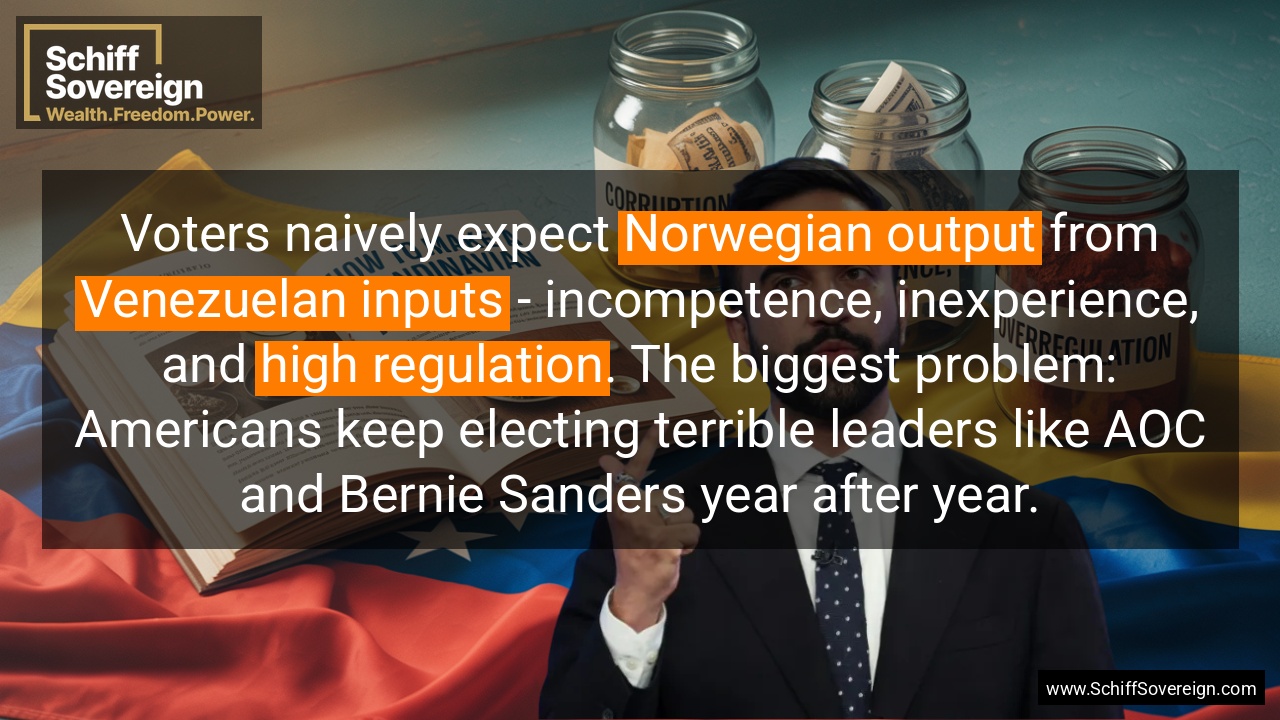 Voters naively expect *Norwegian output* from *Venezuelan inputs* - incompetence, inexperience, and *high regulation*. The biggest problem: Americans keep electing terrible leaders like AOC and Bernie Sanders year after year.