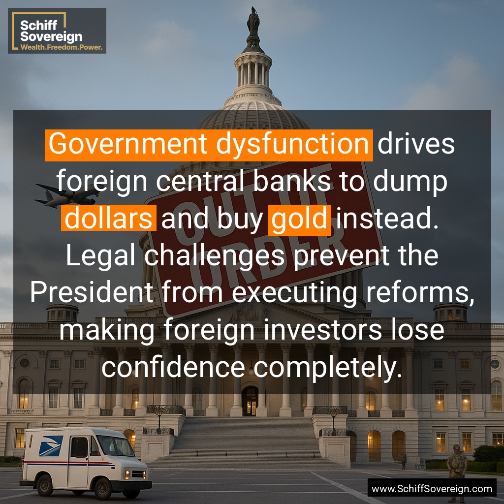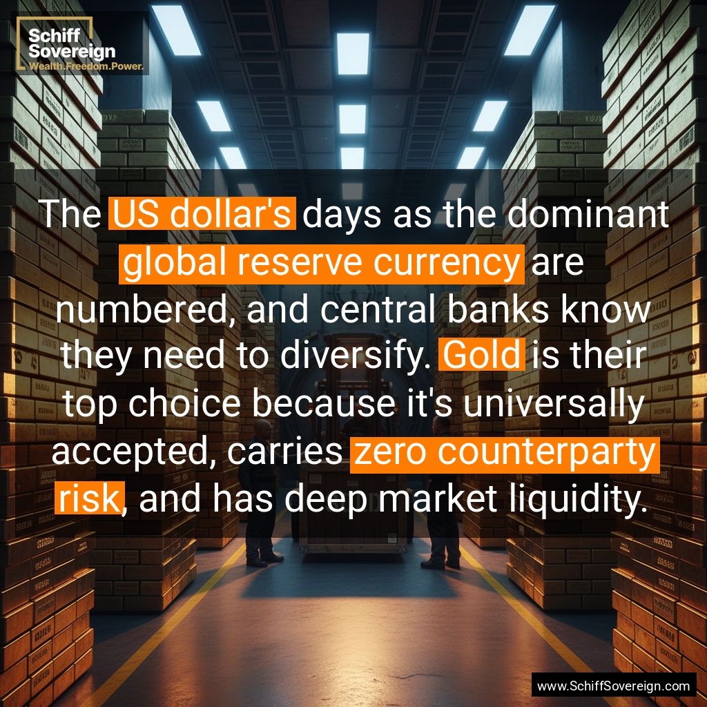 The *US dollar's* days as the dominant *global reserve currency* are numbered, and central banks know they need to diversify. *Gold* is their top choice because it's universally accepted, carries *zero counterparty risk*, and has deep market liquidity.