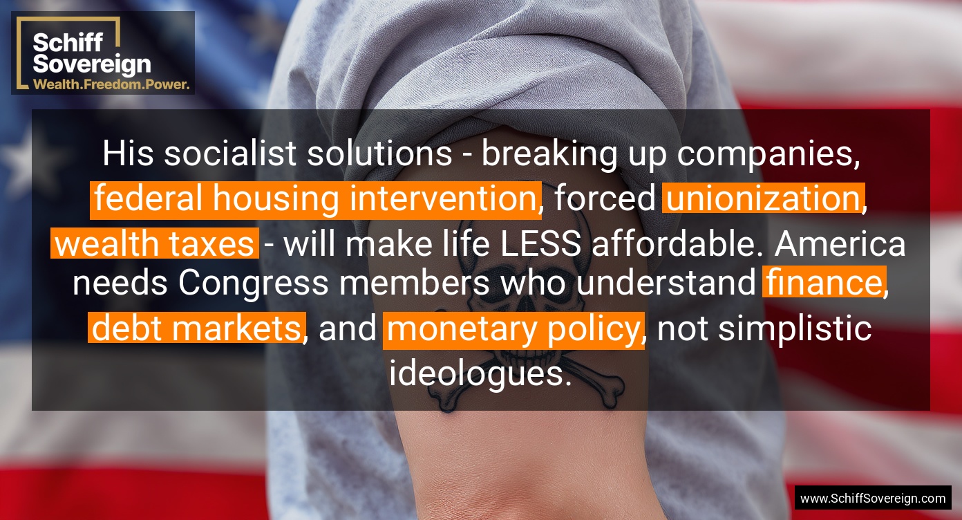 His socialist solutions - breaking up companies, *federal housing intervention*, forced *unionization*, *wealth taxes* - will make life LESS affordable. America needs Congress members who understand *finance*, *debt markets*, and *monetary policy*, not simplistic ideologues.