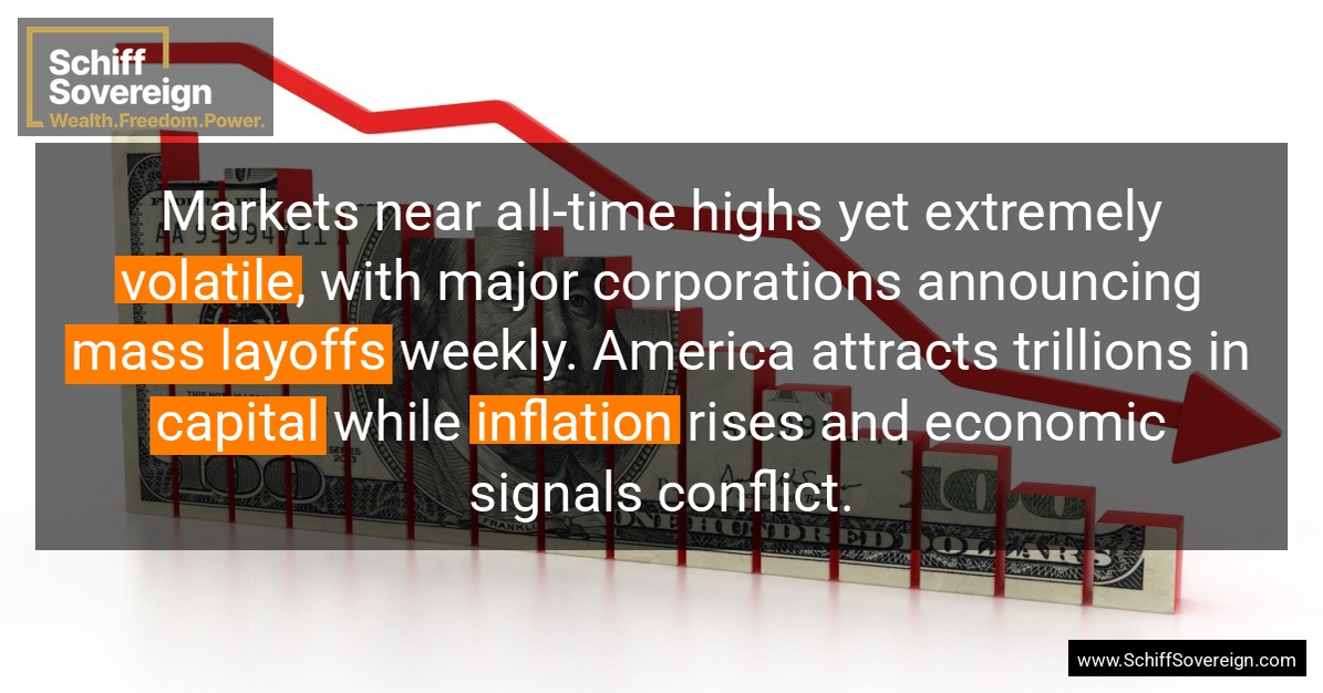 Markets near all-time highs yet extremely *volatile*, with major corporations announcing *mass layoffs* weekly. America attracts trillions in *capital* while *inflation* rises and economic signals conflict.