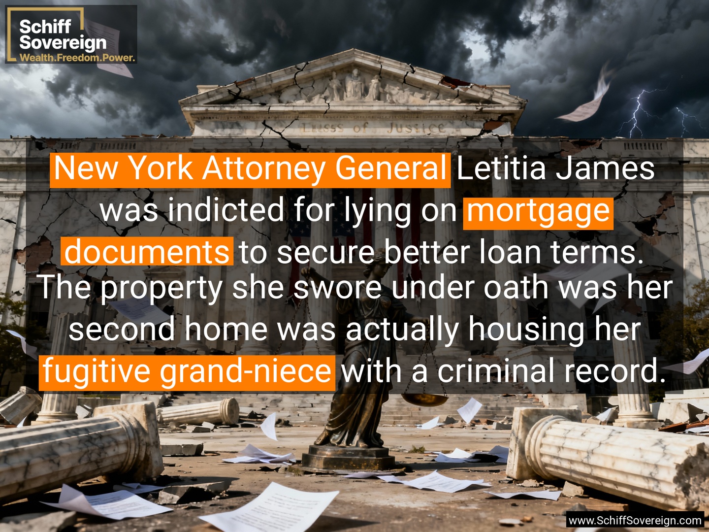 *New York Attorney General* Letitia James was indicted for lying on *mortgage documents* to secure better loan terms. The property she swore under oath was her second home was actually housing her *fugitive grand-niece* with a criminal record.