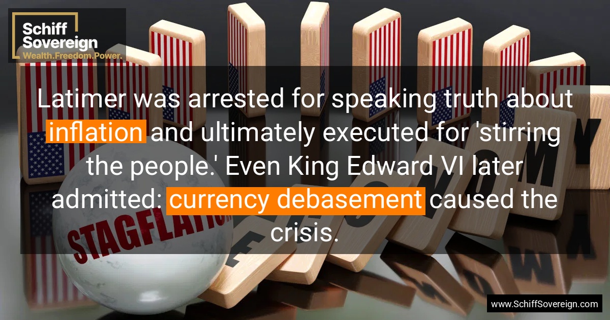 Latimer was arrested for speaking truth about *inflation* and ultimately executed for 'stirring the people.' Even King Edward VI later admitted: *currency debasement* caused the crisis.