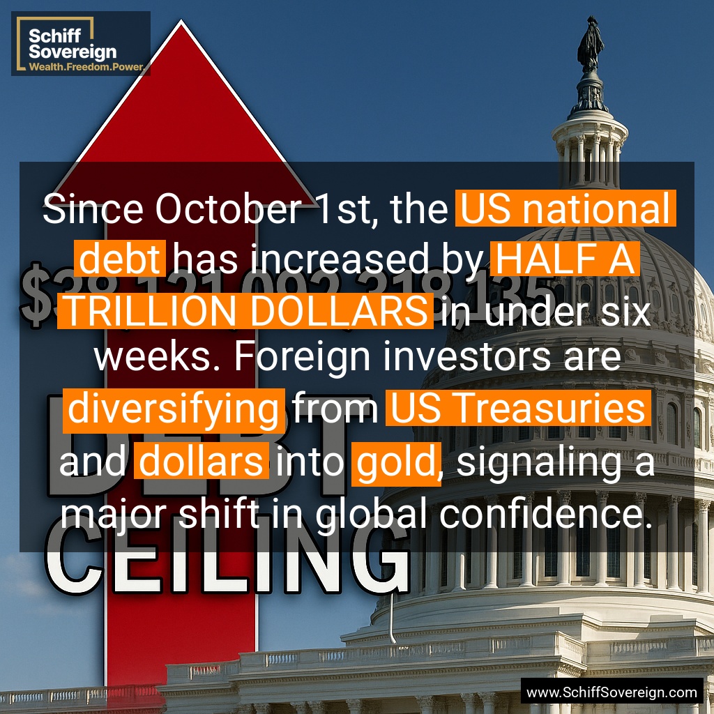 Since October 1st, the *US national debt* has increased by *HALF A TRILLION DOLLARS* in under six weeks. Foreign investors are *diversifying* from *US Treasuries* and *dollars* into *gold*, signaling a major shift in global confidence.