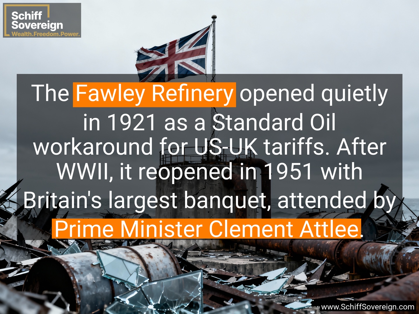 The *Fawley Refinery* opened quietly in 1921 as a Standard Oil workaround for US-UK tariffs. After WWII, it reopened in 1951 with Britain's largest banquet, attended by *Prime Minister Clement Attlee*.