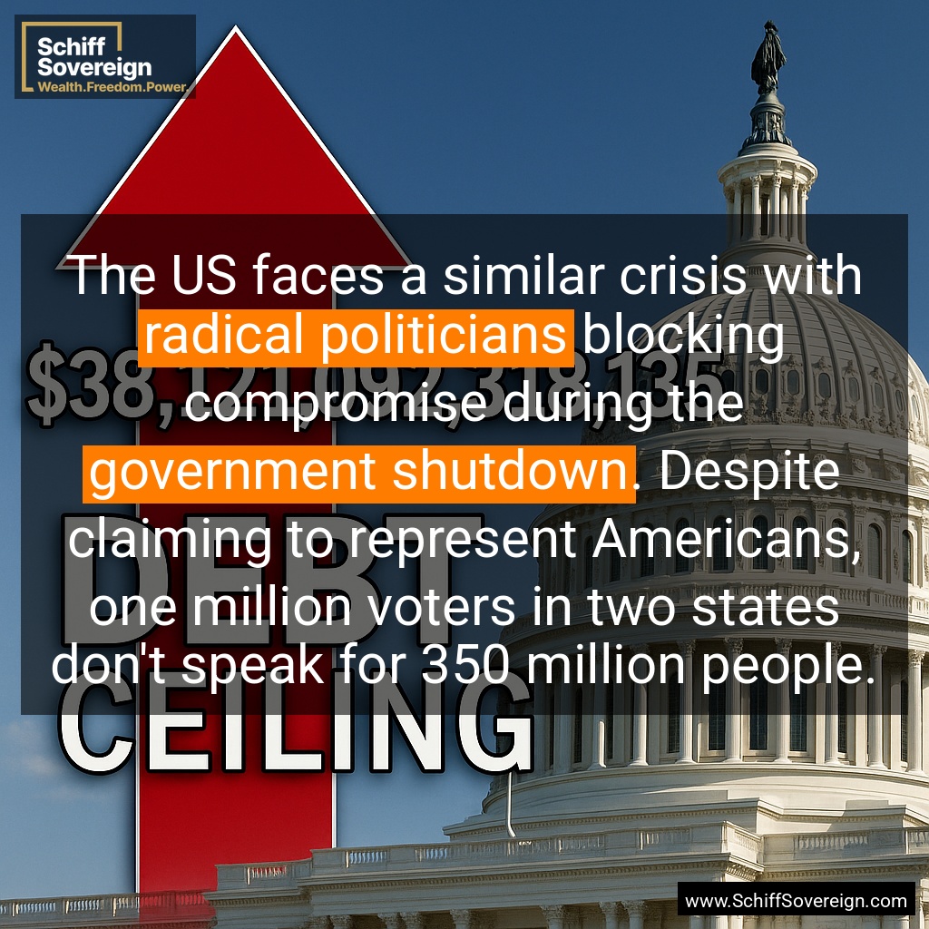 The US faces a similar crisis with *radical politicians* blocking compromise during the *government shutdown*. Despite claiming to represent Americans, one million voters in two states don't speak for 350 million people.