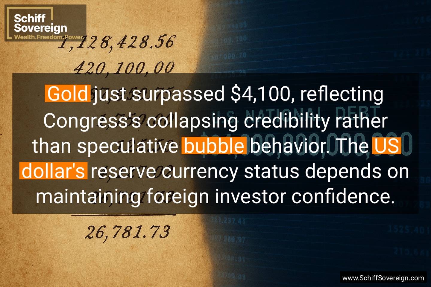 *Gold* just surpassed $4,100, reflecting Congress's collapsing credibility rather than speculative *bubble* behavior. The *US dollar's* reserve currency status depends on maintaining foreign investor confidence.