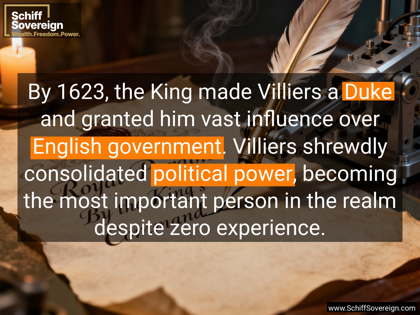By 1623, the King made Villiers a *Duke* and granted him vast influence over *English government*. Villiers shrewdly consolidated *political power*, becoming the most important person in the realm despite zero experience.