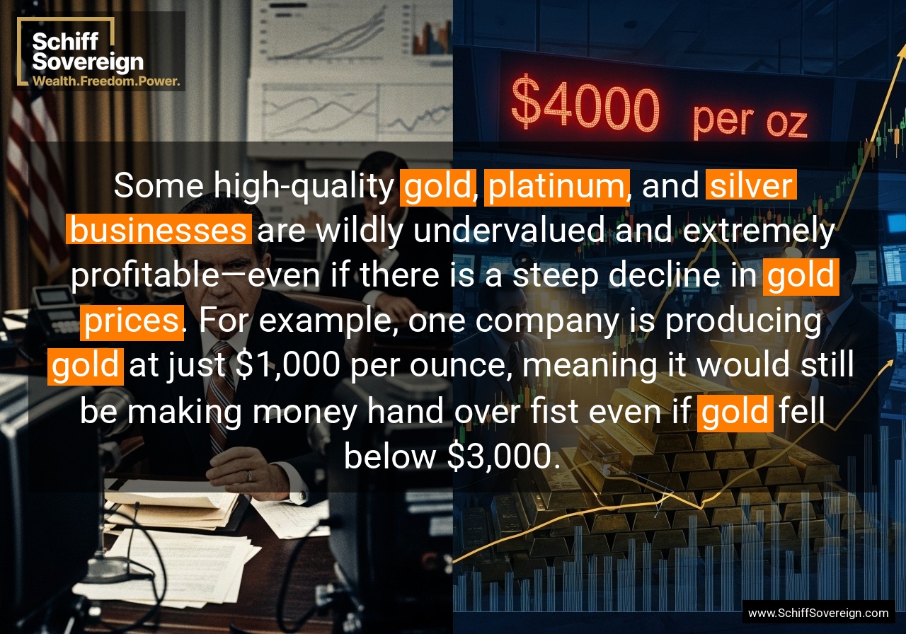 Some high-quality *gold*, *platinum*, and *silver businesses* are wildly undervalued and extremely profitable—even if there is a steep decline in *gold prices*. For example, one company is producing *gold* at just $1,000 per ounce, meaning it would still be making money hand over fist even if *gold* fell below $3,000.