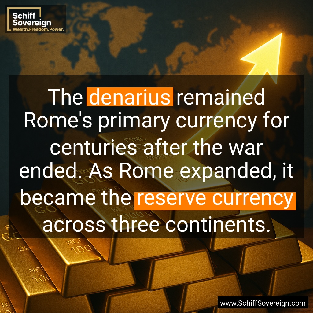 The *denarius* remained Rome's primary currency for centuries after the war ended. As Rome expanded, it became the *reserve currency* across three continents.