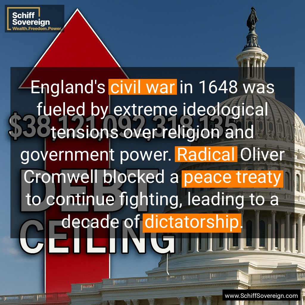 England's *civil war* in 1648 was fueled by extreme ideological tensions over religion and government power. *Radical* Oliver Cromwell blocked a *peace treaty* to continue fighting, leading to a decade of *dictatorship*.