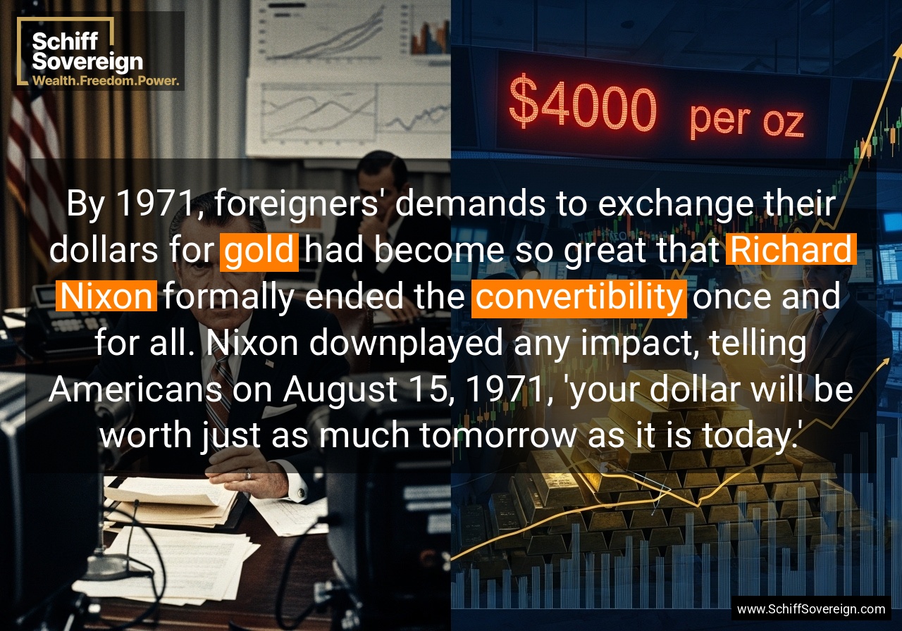 By 1971, foreigners' demands to exchange their dollars for *gold* had become so great that *Richard Nixon* formally ended the *convertibility* once and for all. Nixon downplayed any impact, telling Americans on August 15, 1971, 'your dollar will be worth just as much tomorrow as it is today.'