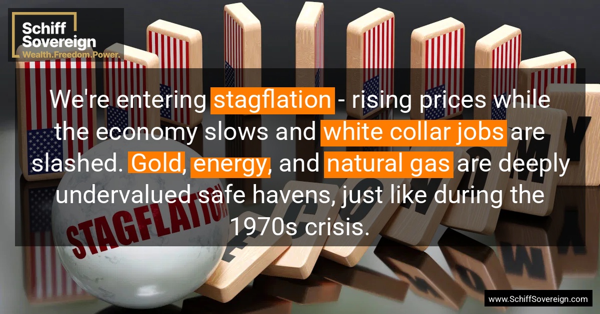 We're entering *stagflation* - rising prices while the economy slows and *white collar jobs* are slashed. *Gold*, *energy*, and *natural gas* are deeply undervalued safe havens, just like during the 1970s crisis.