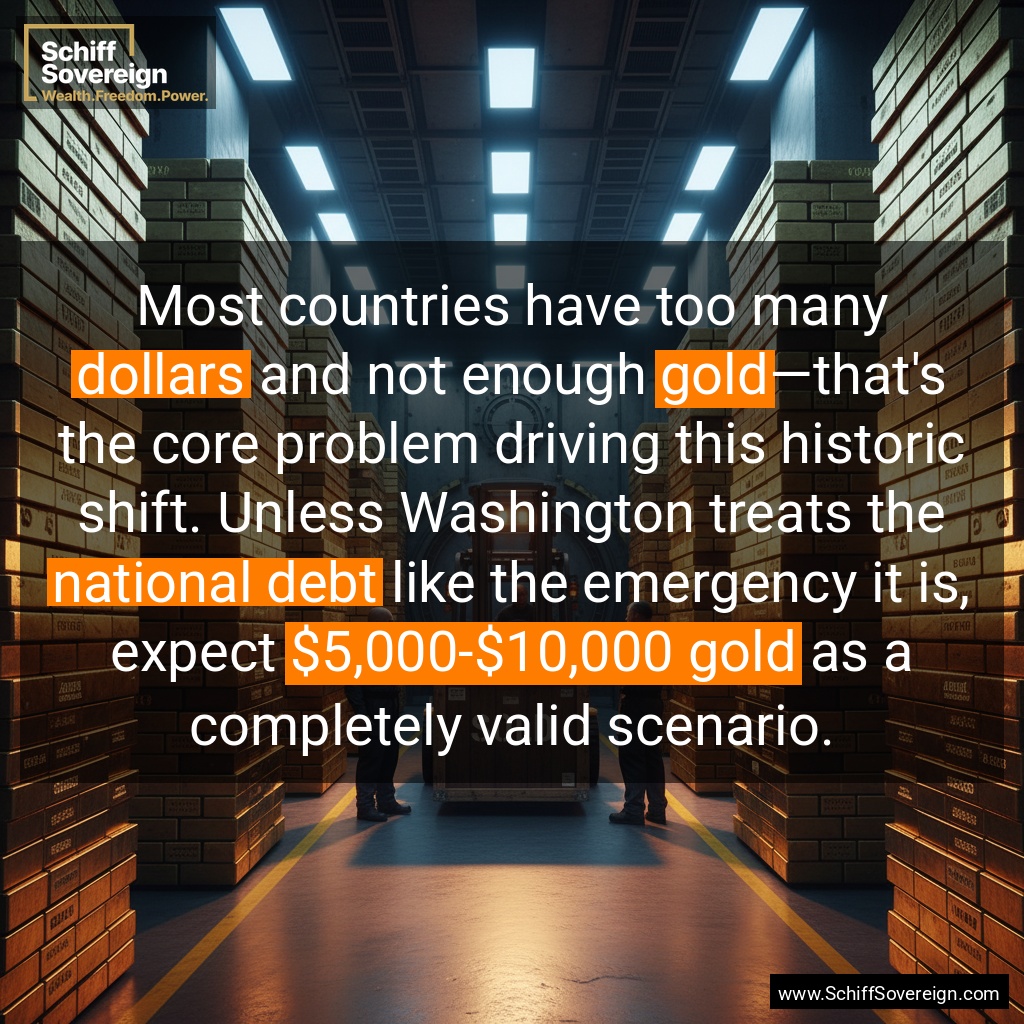 Most countries have too many *dollars* and not enough *gold*—that's the core problem driving this historic shift. Unless Washington treats the *national debt* like the emergency it is, expect *$5,000-$10,000 gold* as a completely valid scenario.