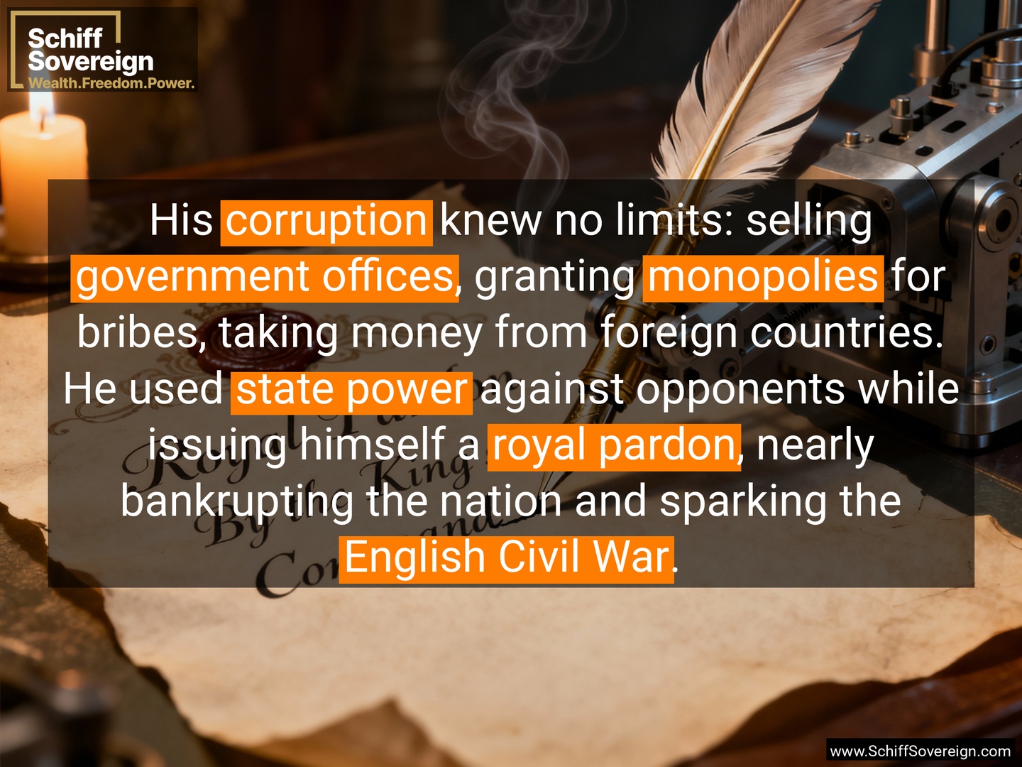 His *corruption* knew no limits: selling *government offices*, granting *monopolies* for bribes, taking money from foreign countries. He used *state power* against opponents while issuing himself a *royal pardon*, nearly bankrupting the nation and sparking the *English Civil War*.