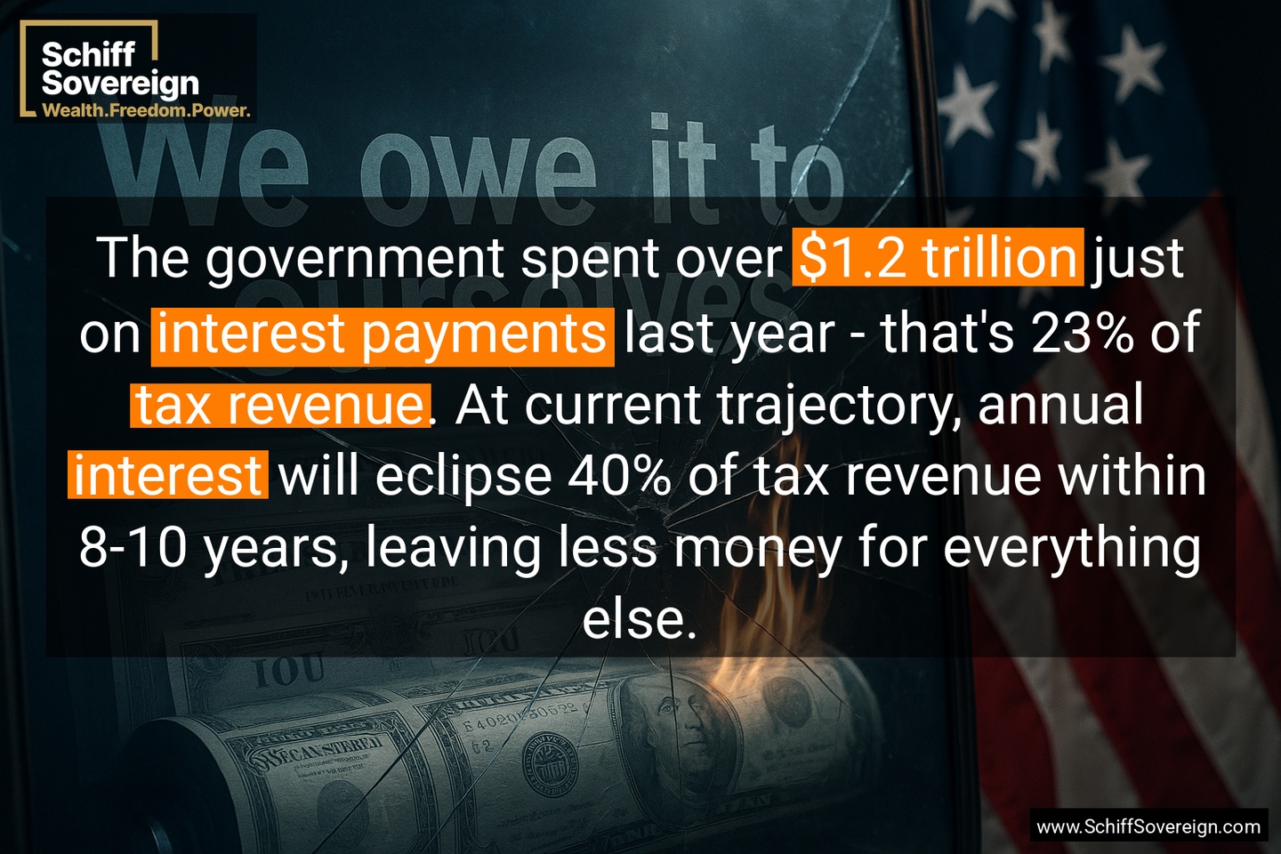 The government spent over *$1.2 trillion* just on *interest payments* last year - that's 23% of *tax revenue*. At current trajectory, annual *interest* will eclipse 40% of tax revenue within 8-10 years, leaving less money for everything else.