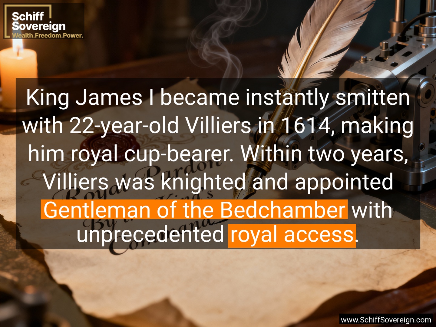 King James I became instantly smitten with 22-year-old Villiers in 1614, making him royal cup-bearer. Within two years, Villiers was knighted and appointed *Gentleman of the Bedchamber* with unprecedented *royal access*.