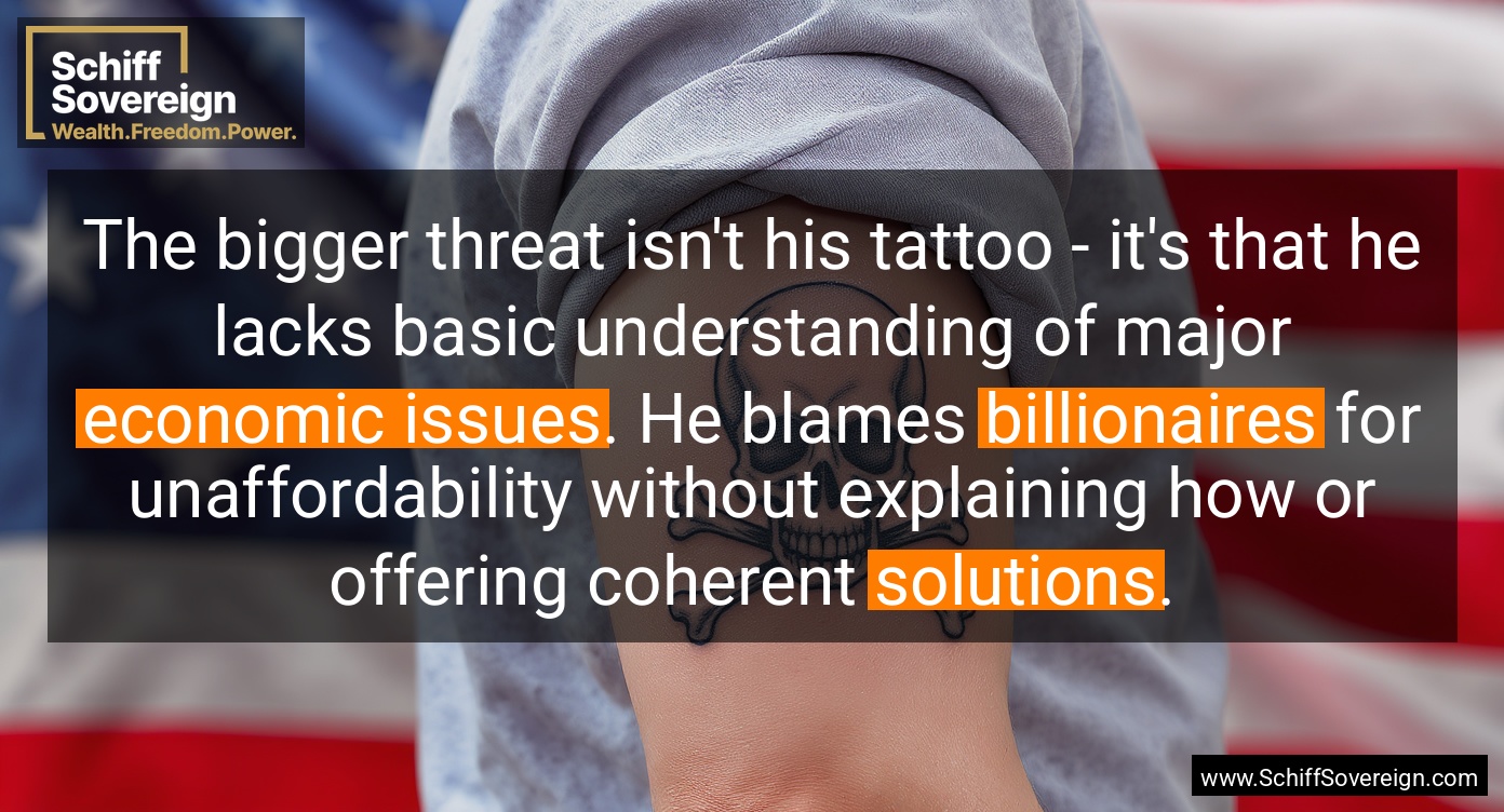 The bigger threat isn't his tattoo - it's that he lacks basic understanding of major *economic issues*. He blames *billionaires* for unaffordability without explaining how or offering coherent *solutions*.