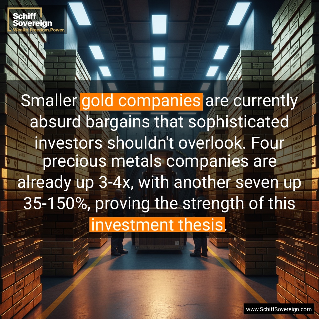 Smaller *gold companies* are currently absurd bargains that sophisticated investors shouldn't overlook. Four precious metals companies are already up 3-4x, with another seven up 35-150%, proving the strength of this *investment thesis*.