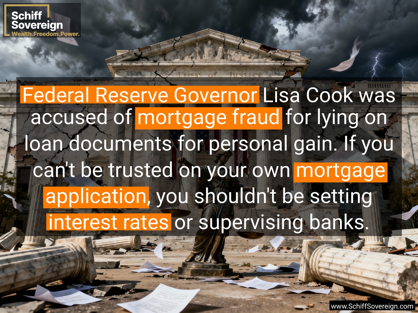 *Federal Reserve Governor* Lisa Cook was accused of *mortgage fraud* for lying on loan documents for personal gain. If you can't be trusted on your own *mortgage application*, you shouldn't be setting *interest rates* or supervising banks.
