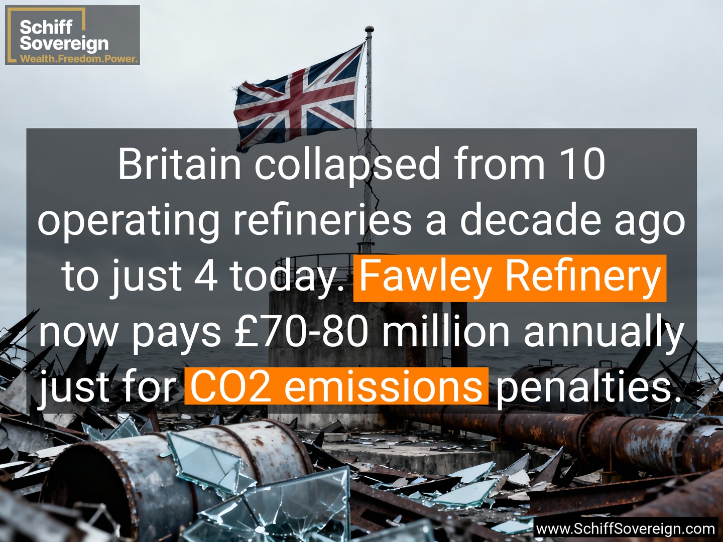 Britain collapsed from 10 operating refineries a decade ago to just 4 today. *Fawley Refinery* now pays £70-80 million annually just for *CO2 emissions* penalties.