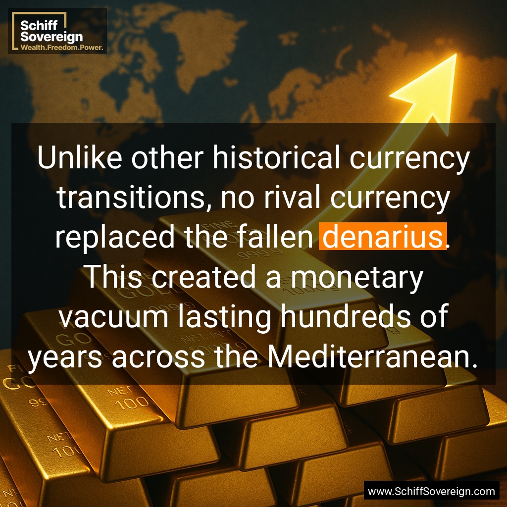 Unlike other historical currency transitions, no rival currency replaced the fallen *denarius*. This created a monetary vacuum lasting hundreds of years across the Mediterranean.