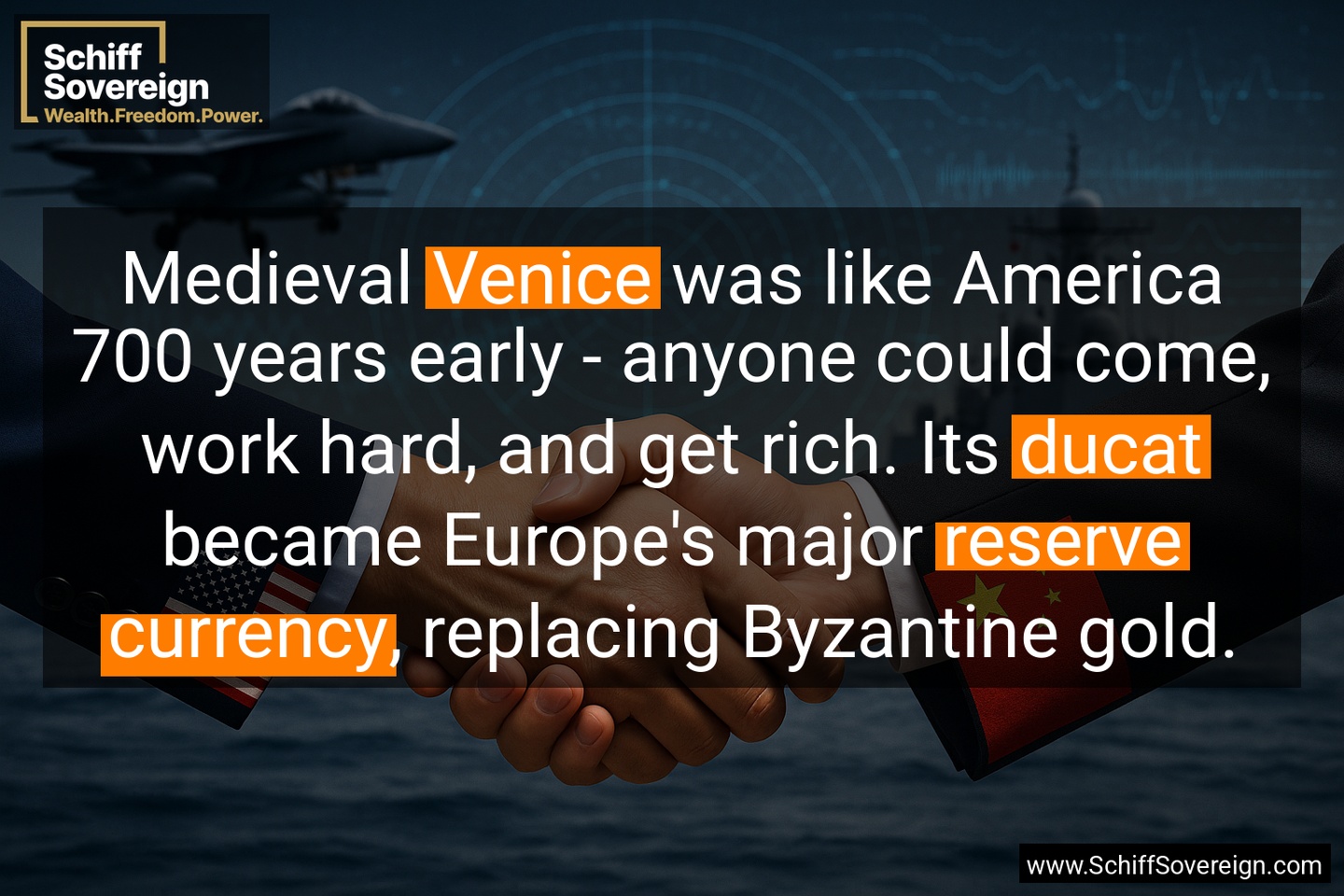 Medieval *Venice* was like America 700 years early - anyone could come, work hard, and get rich. Its *ducat* became Europe's major *reserve currency*, replacing Byzantine gold.