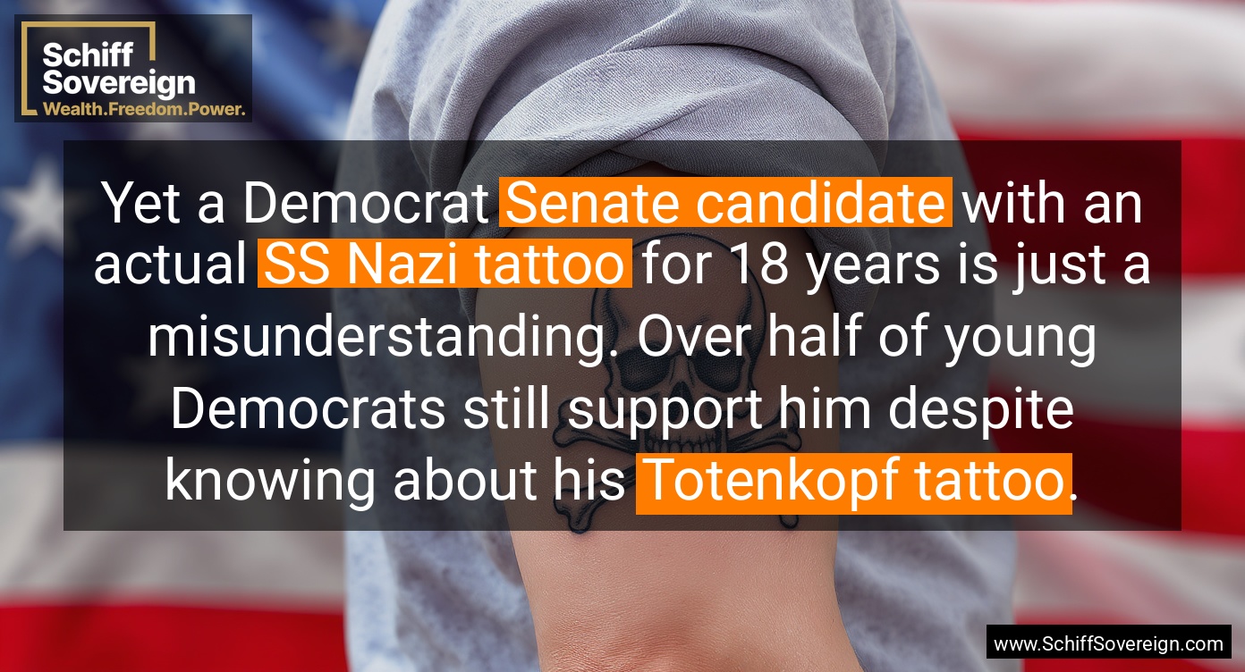 Yet a Democrat *Senate candidate* with an actual *SS Nazi tattoo* for 18 years is just a misunderstanding. Over half of young Democrats still support him despite knowing about his *Totenkopf tattoo*.