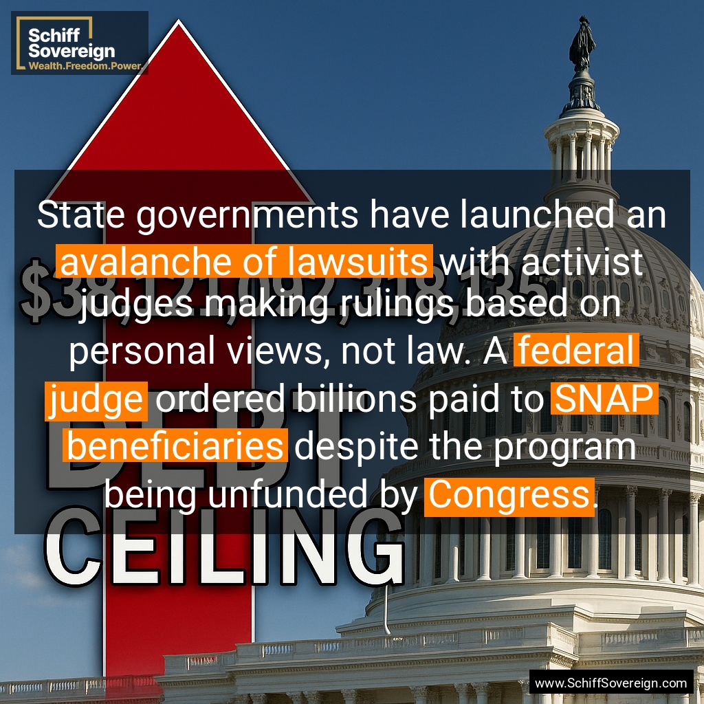 State governments have launched an *avalanche of lawsuits* with activist judges making rulings based on personal views, not law. A *federal judge* ordered billions paid to *SNAP beneficiaries* despite the program being unfunded by *Congress*.