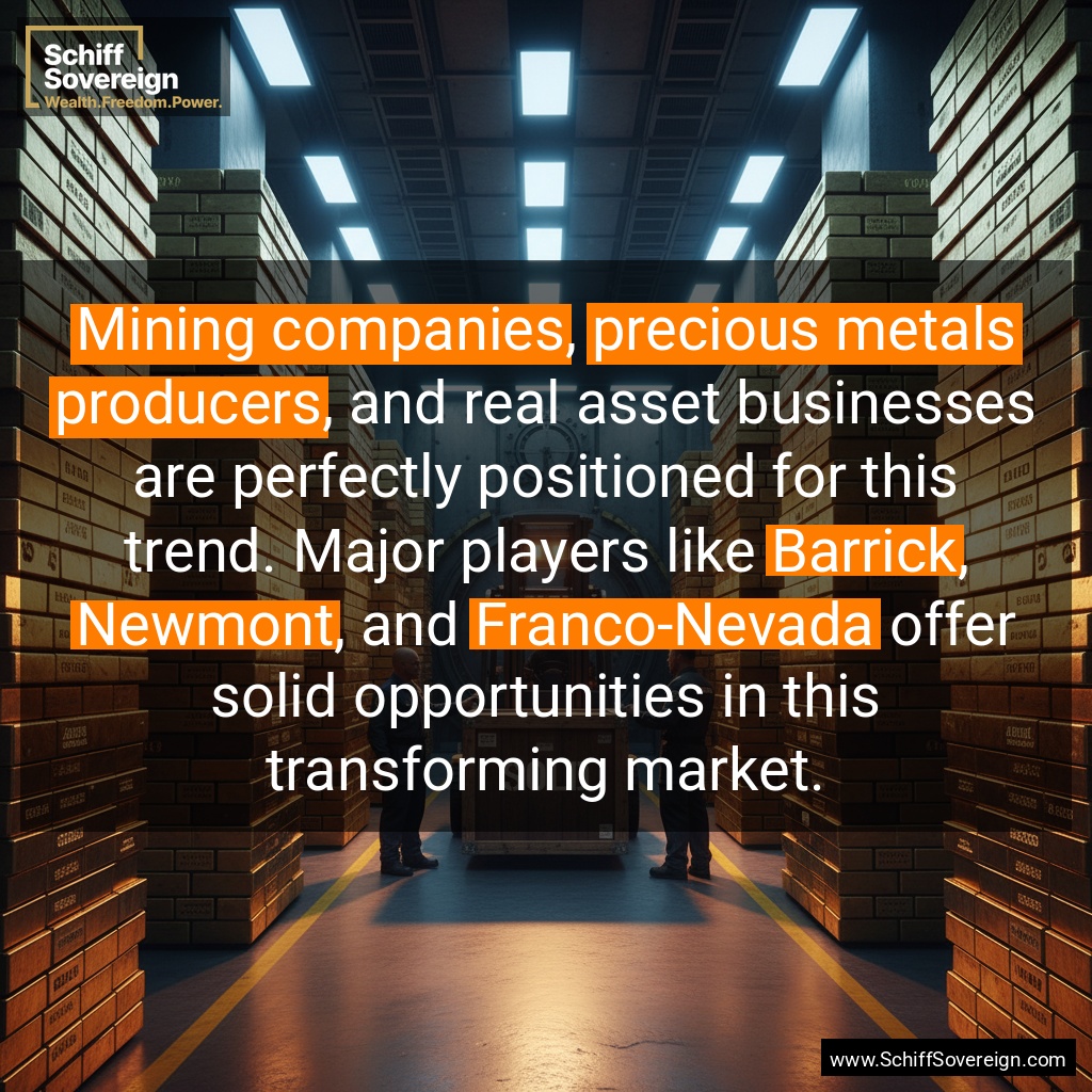 *Mining companies*, *precious metals producers*, and real asset businesses are perfectly positioned for this trend. Major players like *Barrick*, *Newmont*, and *Franco-Nevada* offer solid opportunities in this transforming market.
