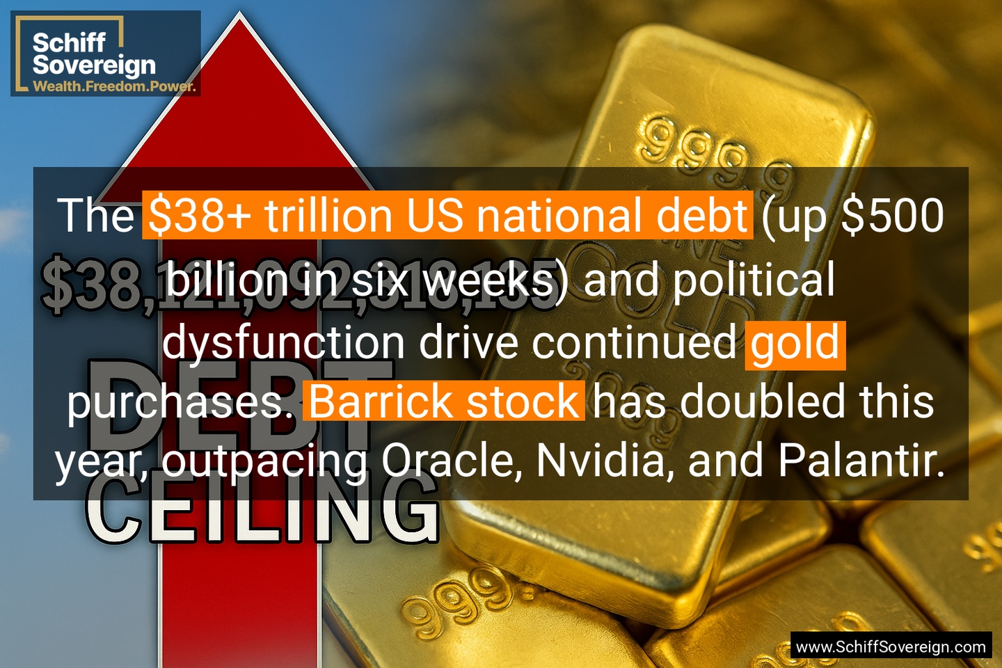The *$38+ trillion US national debt* (up $500 billion in six weeks) and political dysfunction drive continued *gold* purchases. *Barrick stock* has doubled this year, outpacing Oracle, Nvidia, and Palantir.