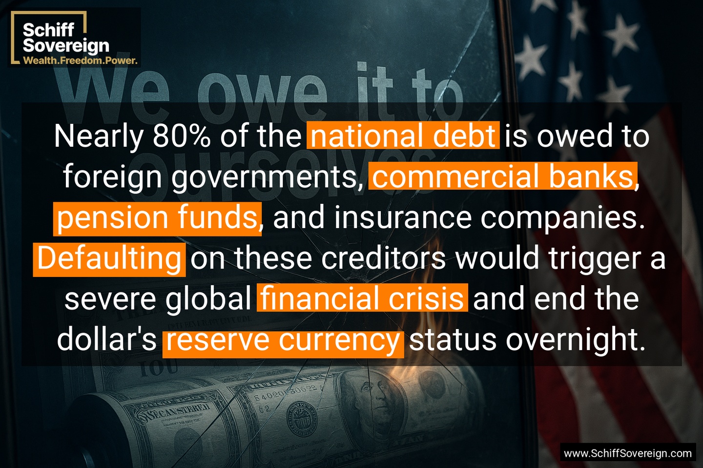 Nearly 80% of the *national debt* is owed to foreign governments, *commercial banks*, *pension funds*, and insurance companies. *Defaulting* on these creditors would trigger a severe global *financial crisis* and end the dollar's *reserve currency* status overnight.