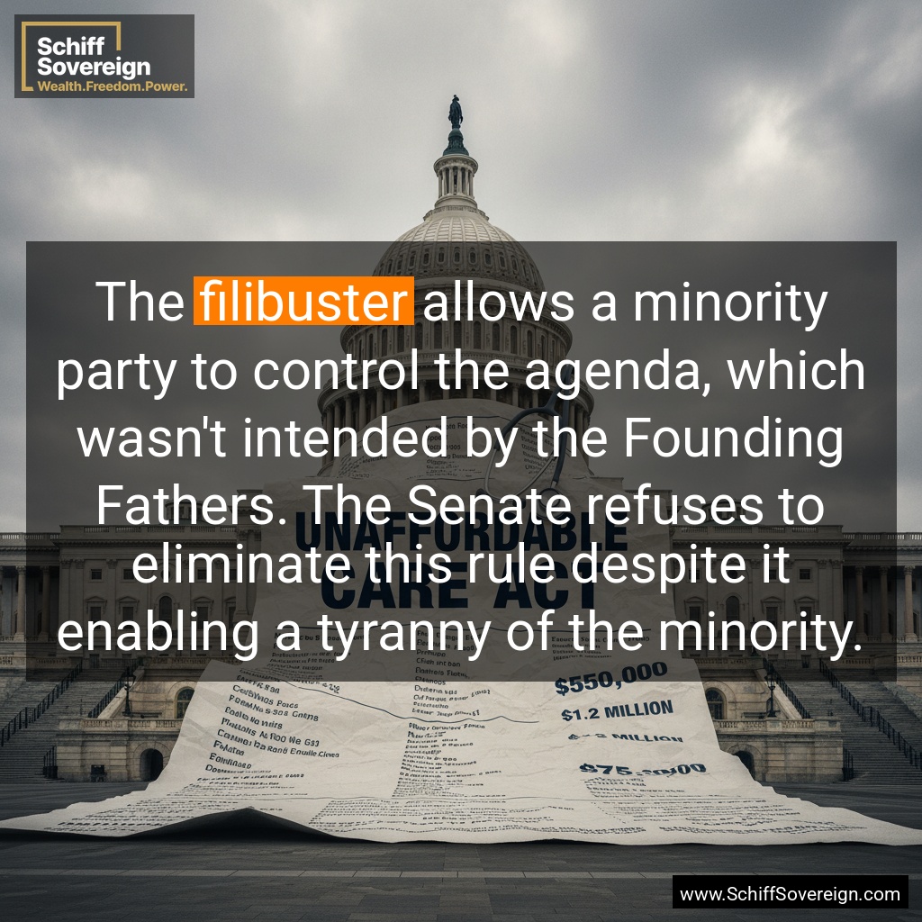 The *filibuster* allows a minority party to control the agenda, which wasn't intended by the Founding Fathers. The Senate refuses to eliminate this rule despite it enabling a tyranny of the minority.