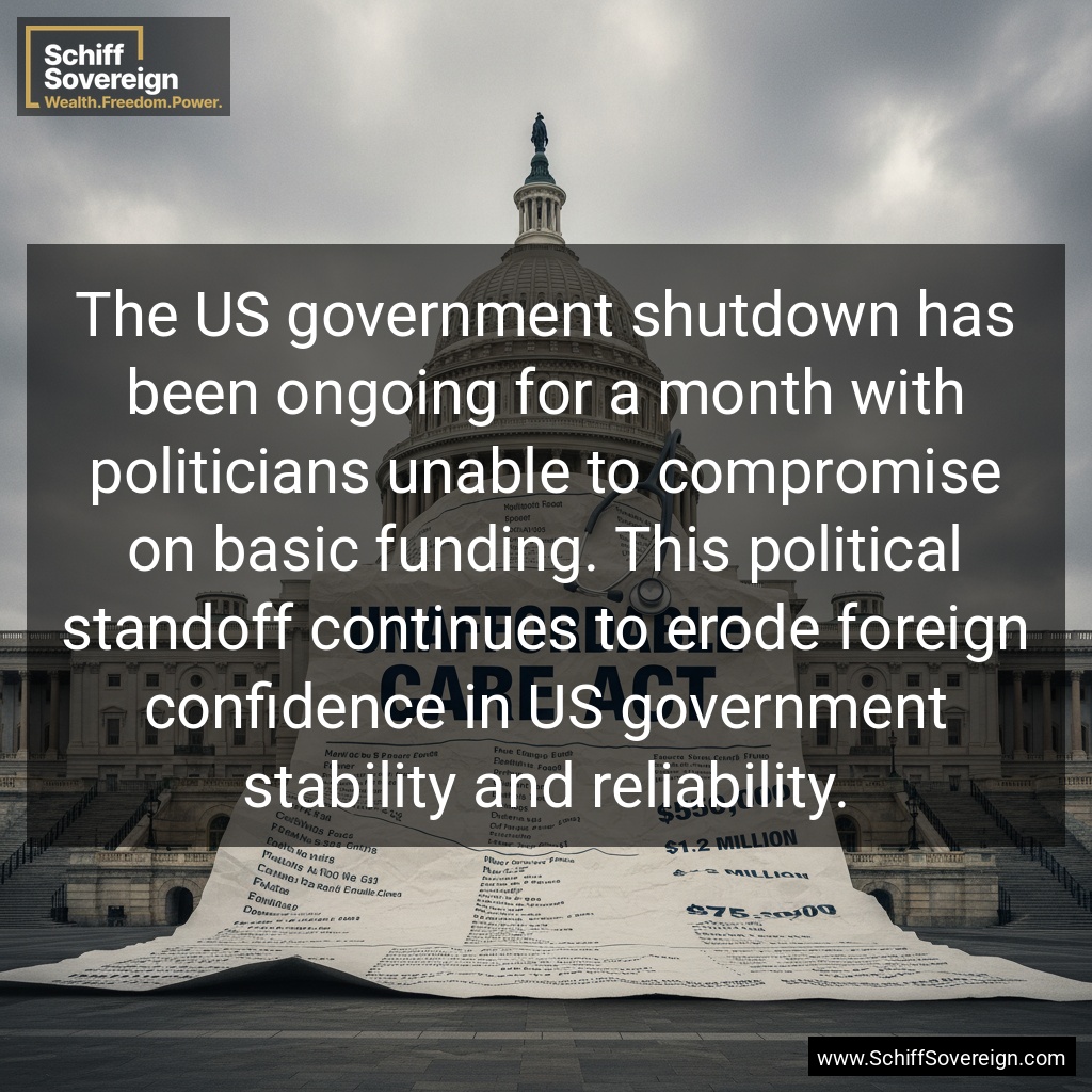 The US government shutdown has been ongoing for a month with politicians unable to compromise on basic funding. This political standoff continues to erode foreign confidence in US government stability and reliability.