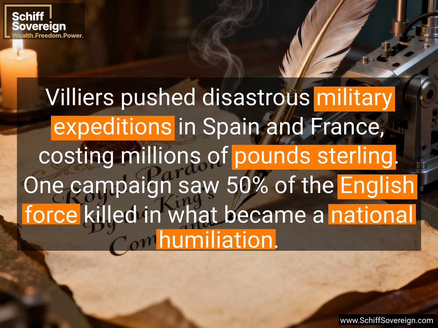 Villiers pushed disastrous *military expeditions* in Spain and France, costing millions of *pounds sterling*. One campaign saw 50% of the *English force* killed in what became a *national humiliation*.