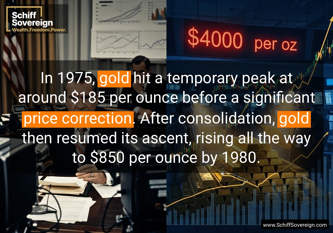 In 1975, *gold* hit a temporary peak at around $185 per ounce before a significant *price correction*. After consolidation, *gold* then resumed its ascent, rising all the way to $850 per ounce by 1980.