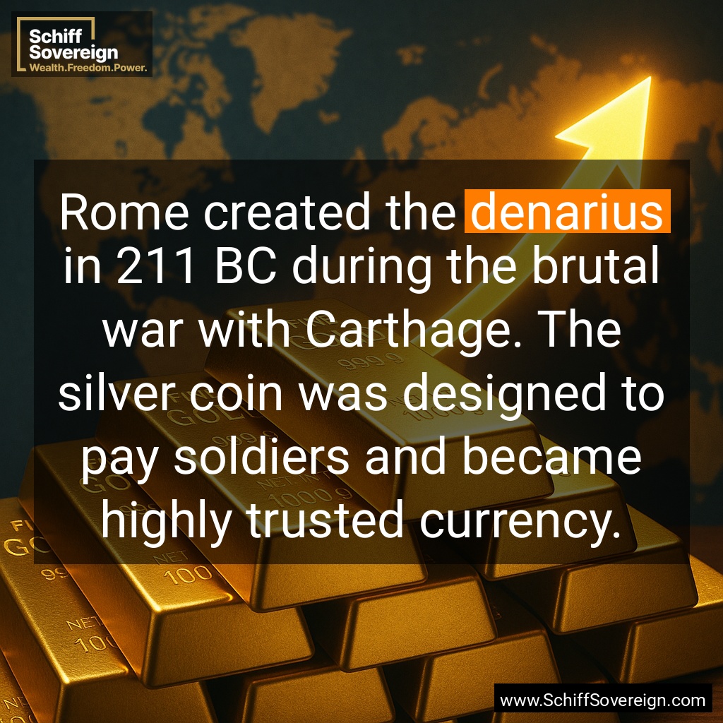 Rome created the *denarius* in 211 BC during the brutal war with Carthage. The silver coin was designed to pay soldiers and became highly trusted currency.
