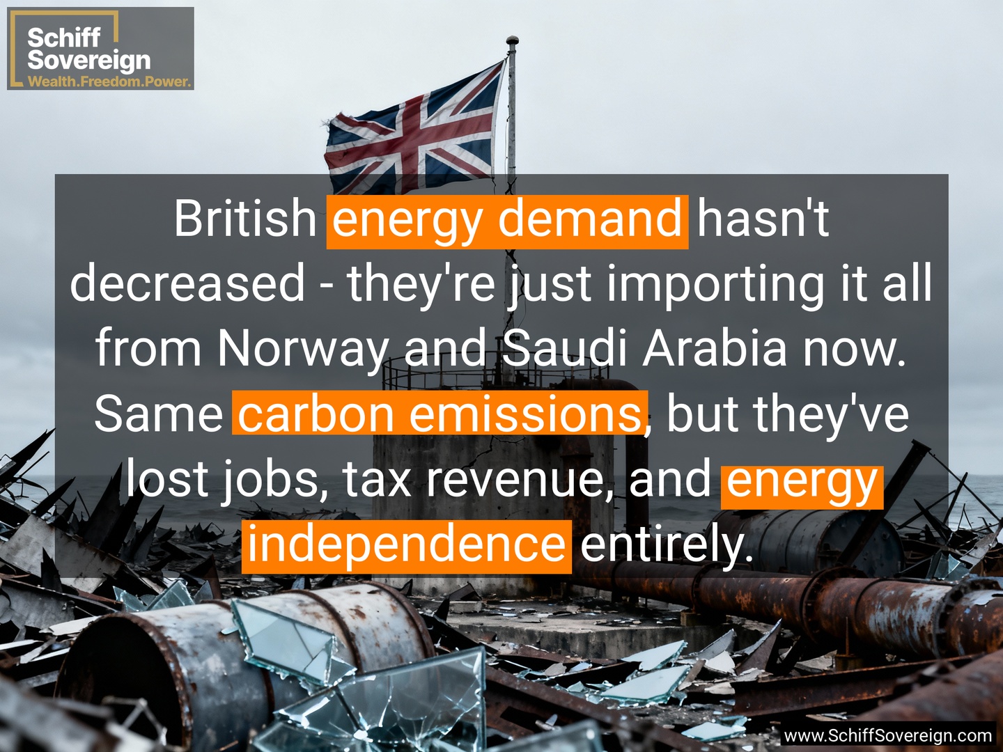 British *energy demand* hasn't decreased - they're just importing it all from Norway and Saudi Arabia now. Same *carbon emissions*, but they've lost jobs, tax revenue, and *energy independence* entirely.