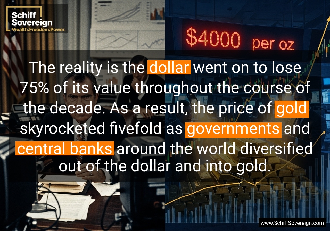 The reality is the *dollar* went on to lose 75% of its value throughout the course of the decade. As a result, the price of *gold* skyrocketed fivefold as *governments* and *central banks* around the world diversified out of the dollar and into gold.
