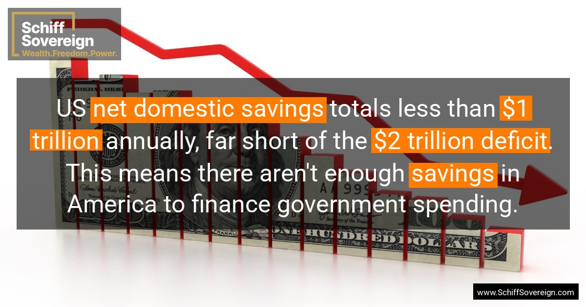 US *net domestic savings* totals less than *$1 trillion* annually, far short of the *$2 trillion deficit*. This means there aren't enough *savings* in America to finance government spending.